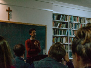 The evening began with a family-style dinner, where students who are interested in farming after graduation had the opportunity to speak with Mr. Becher and his wife, Deidre. Following dinner, Mr. Becher spoke generally to the student body about agrarian life. In his lecture entitled “The Agrarian Life in Catholic Social Teaching,” Mr. Becher emphasized the Church’s stance on the dignity and necessity of agrarian life and the importance of farming as a vocation for the family. The agrarian lifestyle, being difficult to maintain on its own, is uniquely suited to family life. Mr. Becher concluded that family farms and homesteads should be highly encouraged, because farm work is not only necessary for the preservation of society, but also conducive to a productive culture and a beautiful home experience.