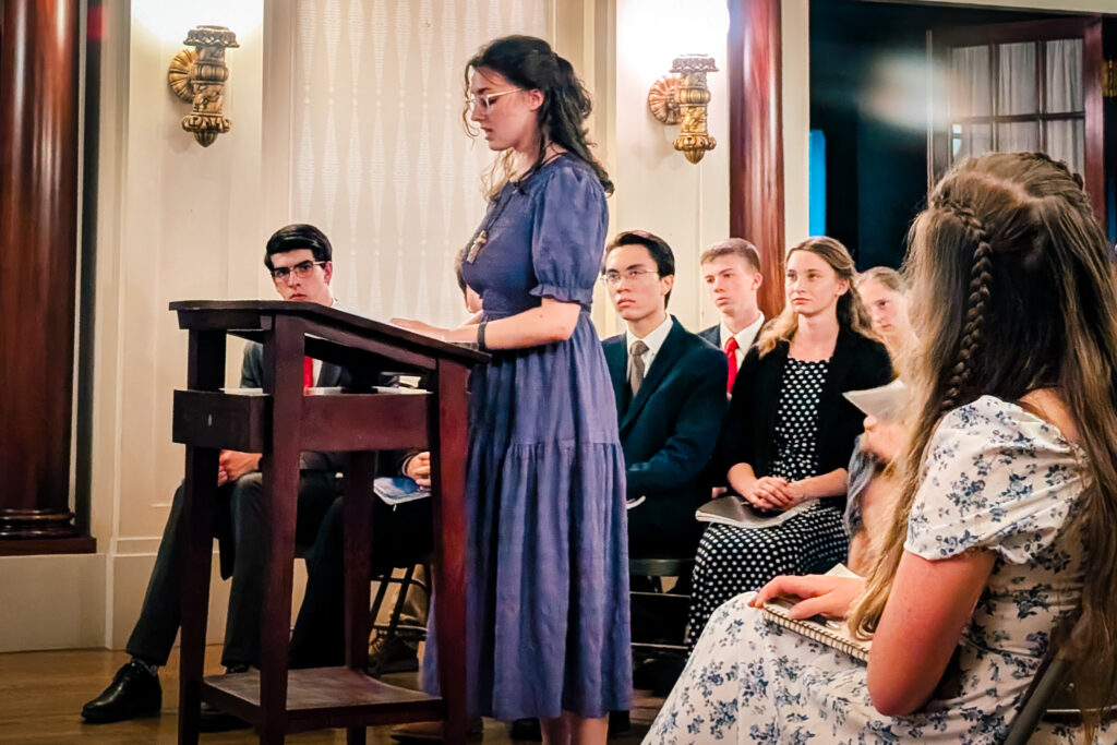 Later in the summer, Great Books II finds students steeping in Shakespeare, this year once again under the guidance of esteemed Catholic author Joseph Pearce. This Summer Program concludes with a presentation of one of the Bard’s plays. Our 2025 participants staged Much Ado About Nothing under the direction of Peter Shanley ’25. The production of the play was a highlight for Peter Baglow. By participating in the Summer Program, he discovered in himself “a great desire to learn how to think more critically and analytically.” Fellow participant Gabriella Cuddeback “loved the opportunities that were given for making friends through dancing, activities, and free time,” adding, “I met some of my closest friends here, since TMC attracts some of the most warm and amazing people ever!”